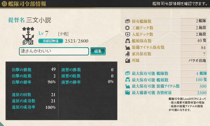 400/30/600/30 です。秘書艦の漣は11レベル、司令部レベルは8です