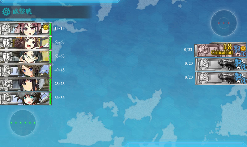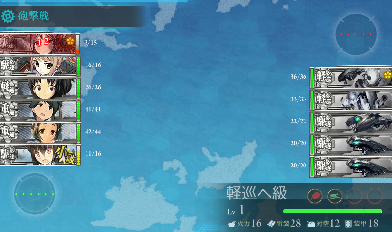 この段階だと全然索敵も成功しないし、敵雷巡の攻撃で瀕死になったりして楽しいです