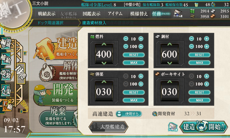 今日はそろそろ戦艦を重点的に狙って建造していこうと思います